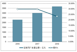 2016-2018年中國(guó)互聯(lián)網(wǎng)廣告營(yíng)業(yè)額及同比增長(zhǎng)