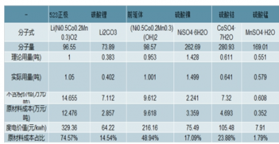 三元523正極主要原材料成本測(cè)算523正極碳酸鋰