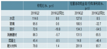 2019H1水泥及玻璃收現(xiàn)比同比提升,玻纖有所下滑,玻璃行業(yè)盈余現(xiàn)金保障倍數(shù)高。2019年上半年除了水泥及玻璃行業(yè)收現(xiàn)比小幅提升外,其余行業(yè)均有不同程度的下滑。其中下滑較多的板塊為玻纖(-10.8)及耐材(-6.0);利潤角度,跟蹤的四大子行業(yè)(水泥、玻璃、玻纖、家裝建材)中,僅水泥、玻璃及耐材的經(jīng)營活動(dòng)現(xiàn)金流/歸母凈利潤處在較為正常的水平,水泥與耐材現(xiàn)金流與凈利潤基本匹配,玻璃經(jīng)營活動(dòng)現(xiàn)金流入高于凈利潤,玻纖和消費(fèi)建材板塊盈余現(xiàn)金保障倍數(shù)同比下滑,混凝土板塊雖同比有較大幅度增長,但仍不樂觀。