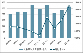 2018年全年全國化妝品零售額達到了2619億元,同比增加9.6%,高于同期社會消費品零售總額增速0.6個百分點。截止至2019年6月全國化妝品零售額為265億元,同比增長22.5%。累計方面,2019年上半年全國化妝品零售額達到1462億元,與去年同期相比增長13.2%。