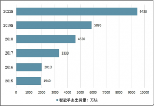 2018年全球智能手表的出貨量將達(dá)到4620萬塊,2022年產(chǎn)品的出貨量增加至9430萬塊。其在可穿戴設(shè)備出貨量的市場(chǎng)份額將增加至43.06%。