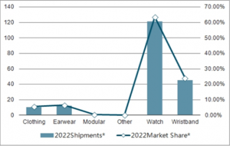 2022年世界范圍內(nèi)的可穿戴產(chǎn)品預(yù)測(數(shù)以百萬計的出貨量)