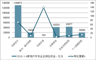 2019年1-9月房地產(chǎn)開發(fā)企業(yè)到位資金130571億元,同比增長7.1%。其中,國內(nèi)貸款19689億元,增長9.1%;利用外資104億元,增長1.4倍;自籌資金42024億元,增長3.5%;定金及預收款43877億元,增長9.0%;個人按揭貸款19900億元,增長13.6%。