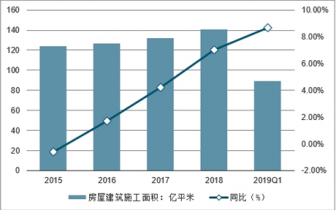 2015-2019年中國房屋建筑施工面積及同比增長走勢