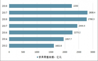 2012-2018年中國家具零售規(guī)模增長情況(單位:億元)