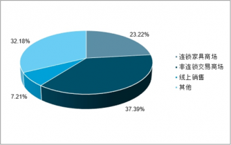 按照不同零售渠道劃分,家具零售可分為連鎖賣場、非連鎖賣場、在線零售和其他渠道。2018年非連鎖交易商場占比為37.39%;連鎖家具商場占比為23.22%;在線零售份額達(dá)到了7.21%。