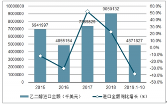 2015-2019年1-10月中國(guó)乙二醇進(jìn)口金額及增速趨勢(shì)圖
