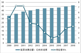 十年來,能源消費(fèi)總量持續(xù)上升,2018年較2009年能源消費(fèi)總量增長(zhǎng)了38%。從增速看,2012年開始,同比增速持續(xù)下降,至2015年轉(zhuǎn)向開始回升。與2010年(7.3%)、2011(7.3%)年的高增速相比,2012年以來均屬于低增速狀態(tài)。
