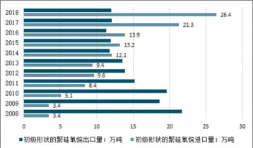 我國初級形狀的聚硅氧烷出口量從2008年的3.4萬噸增至2018年的26.4萬噸,年均復合增速為22.79%。而同期進口量則從21.7萬噸降至12.0萬噸,降幅達44.60%。