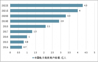 2018年中國電子競(jìng)技用戶4億人,占據(jù)全球規(guī)模一般以上。預(yù)計(jì)2022年,中國電子競(jìng)技用戶規(guī)模將達(dá)4.3億人,這意味著近1/4的中國人都在關(guān)注電子競(jìng)技。