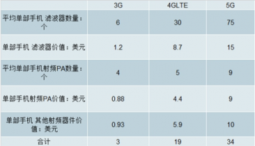 據(jù)估計,單部5G手機的PA價值為9美元、濾波器價值為15美元,其他器件價值為10美元,預(yù)計單部5G智能手機的射頻前端成本為34美元,單部旗艦4GLTE智能手機的射頻前端成本為19美元。其他智能手機方面,估計射頻前端成本平均約為8.7美元/部。