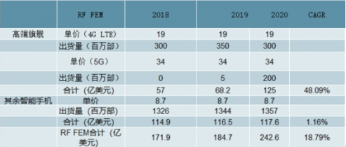 出貨量方面,預(yù)計2019年將有第.一批5G智能手機出貨,而2020年將達到2.13億部,綜合單機射頻前端成本計算得出2019年智能手機射頻前端市場將達到184.7億美元,2020年將達到242.6億美元,CAGR達18.79%。