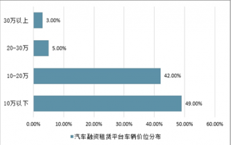 我國汽車融資租賃行業(yè)整體起步較晚,汽車融資租賃市場整體規(guī)模依然較小,仍處于發(fā)展的初級階段,但發(fā)展迅速,潛力巨大。在我國汽車租賃平臺車輛品牌中,合資品牌和國產品牌各占一半市場;從價格來看,20萬以下的車型數(shù)量最多,占比超過90%,其中10萬以下的車型數(shù)量占比接近50%。在成熟的歐美租車市場,前十家的國際知名租車公司如赫茲、百捷樂,占據(jù)了超過90%的租車市場份額,中小規(guī)模的汽車租賃公司非常少。反觀國內汽車租賃市場,近80%的市場份額被傳統(tǒng)的上萬家中小汽車租賃公司占有,且車輛價格偏低。這主要是由于汽車融資租賃公司的目標客戶是信用和收入水平較低的次級信貸人群,低價和高性價比商品符合目標人群的消費特征。