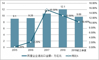 2019年前三季度民營企業(yè)進(jìn)出口9.69萬億元,增長10.4%,其中,出口6.4萬億元,增長13%;進(jìn)口3.29萬億元,增長5.9%。
