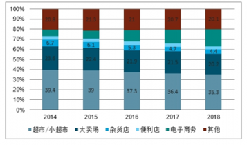 數(shù)據(jù)顯示,電商渠道增長實(shí)際上首次略有放緩,從2014年至2018年間35.1%的年均增速,減緩為2017年至2018年的30.6%。但無論以任何標(biāo)準(zhǔn)衡量,這樣的增長速度依然很強(qiáng)勁,與2017-18年大賣場0.8%和雜貨店1.2%的增速下降形成鮮明對比。