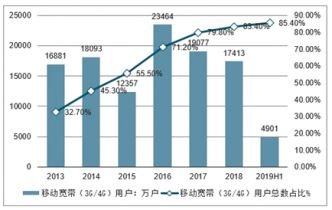 2013-2019年移動(dòng)寬帶(3G/4G)用戶(hù)發(fā)展情況(單位:萬(wàn)戶(hù),%)