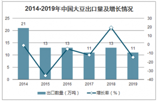 2019年中國大豆出口量有所下降,2019年1-12月中國大豆出口量為11萬噸,同比下降14.5%。