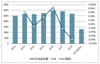 2018年我國乳制品銷量為2681.47萬噸,2019年上半年銷量為1295.04萬噸。行業(yè)的供需規(guī)模保持平穩(wěn)態(tài)勢。
