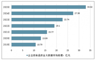 在政策的推動下,政府帶頭建設(shè)食品安全大數(shù)據(jù)系統(tǒng)建設(shè),而企業(yè)作為市場主體,必然是行業(yè)的建設(shè)主力隊伍,未來企業(yè)級食品安全大數(shù)據(jù)市場容量將快速發(fā)展,預(yù)計到2025年達到33.02億元。