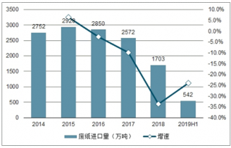 2014-2019年H1中國(guó)進(jìn)口廢紙量及增速趨勢(shì)
