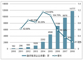 近8余年來,我國融資租賃業(yè)經(jīng)歷了快速發(fā)展,從2010年到2018年,融資租賃公司數(shù)量由2010年不足200家增加到2018的11777家,增長了近65倍。