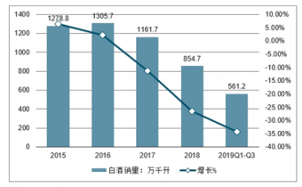 截至2019年前三季度,國內(nèi)白酒銷量實(shí)現(xiàn)561.2萬千升,同比下降19.92%。