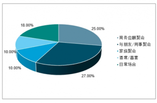 有關(guān)數(shù)據(jù)顯示,在日常場合飲用白酒的比例僅為18%,遠(yuǎn)低于其他酒類。消費(fèi)者飲用白酒的場合中應(yīng)酬聚會占25%,與朋友/同時聚會占27%,家族聚會占10%,酒席和喜宴占10%。