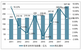 2011-2018年中國粉末涂料行業(yè)市場規(guī)模及增長走勢