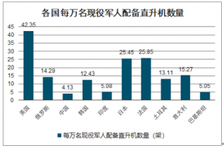 各國每萬名現(xiàn)役軍人配備直升機數(shù)量