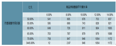 2020 年,一手房代理市場的代理規(guī)模預計能夠達到 800 億。 我們預計在地產(chǎn)政策企穩(wěn)的情形下, 房地產(chǎn)銷售額每年保持 10%的增長速度,現(xiàn)在成熟地區(qū)的房地產(chǎn)市場一手房代理銷售比例早已超過 50%,預計市場整體在 2020 年代理比例達到 60%,代理費用按照 1%來測算,到 2020年,房地產(chǎn)代理市場收入規(guī)模能夠達到 800 億。