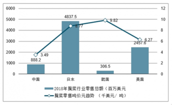 2018年各國腌菜行業(yè)零售總額及零售噸價(jià)趨勢(shì) (千美元/ 噸、百萬美元)