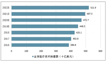 2016-2022年全球醫(yī)療技術(shù)銷售額(十億美元)