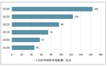 到2020年中國增材制造產(chǎn)業(yè)年銷售收入預(yù)計超過200億元,中國3D打印材料市場規(guī)模2020年將達到57億元,2024年預(yù)計超過160億元,3D打印材料市場發(fā)展前景可期。