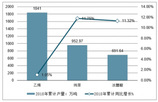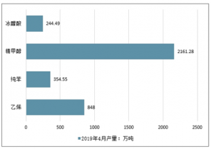 有機(jī)化學(xué)原料包括乙烯、純苯、精甲醇、冰醋酸等,它們是石油化工行業(yè)的主要化學(xué)產(chǎn)品。2018年我國乙烯累計(jì)產(chǎn)量1841萬噸,同比增長1.05%;純苯累計(jì)產(chǎn)量952.97萬噸,同比增長11.75%;冰醋酸累計(jì)產(chǎn)量691.64萬噸,同比增長11.32%。2019年4月,乙烯、純苯、精甲醇、冰醋酸產(chǎn)量分別為848萬噸、354.55萬噸、2161.28萬噸、244.49萬噸。