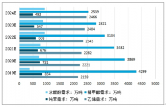 目前我國有機(jī)化學(xué)原料有效供給仍嚴(yán)重不足,進(jìn)口量較大。可以預(yù)計(jì)2024年我國乙烯、純苯、精甲醇、冰醋酸的表觀需求量分別2466萬噸、493萬噸、2539萬噸和926萬噸。