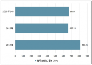 2017-2019年8月精甲醇進(jìn)口量(單位:萬(wàn)噸)