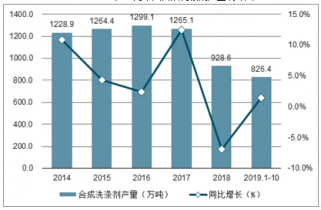 10月中國合成洗滌劑產(chǎn)量為92.8萬噸,同比增長8.3%;2019年1-10月中國合成洗滌劑產(chǎn)量為826.4萬噸,同比增長1.4%。