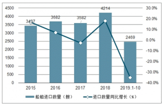 2019年1-10月中國船舶進口數量為2469艘,同比下降35%;2019年1-10月中國船舶進口金額為698214千美元,同比下降28.5%。