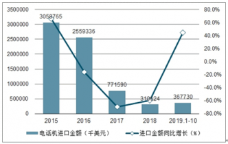 2015-2019年1-10月中國電話機金額及增速趨勢圖