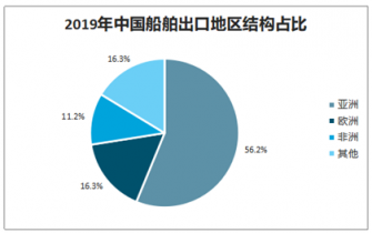 2019年1~11月,我國船舶出口金額為221.2億美元,同比下降10.3%。出口船舶產(chǎn)品中,散貨船、油船和集裝箱船仍占主導(dǎo)地位,出口額合計(jì)112.7億美元,占出口總額的50.9%。船舶產(chǎn)品出口到212個(gè)國家和地區(qū),仍然以亞洲為主。我國向亞洲出口船舶的金額為124.3億美元,占出口總額的56.2%;向歐洲出口船舶的金額為36.1億美元,占16.3%;向非洲出口船舶的金額為24.8億美元,占11.2%。