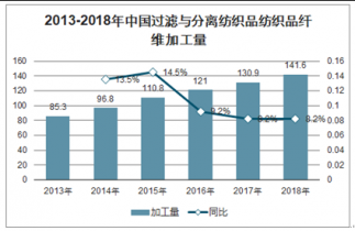 2013-2018年中國過濾與分離紡織品紡織品纖維加工量一直維持穩(wěn)步上升趨勢,2018年已經(jīng)達到141.6萬噸,較上年增加8.2%。