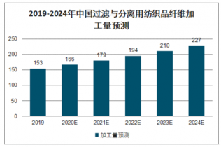 2019-2024年中國過濾與分離用紡織品纖維加工量將會繼續(xù)上升,預(yù)計在2024年達到227億元。