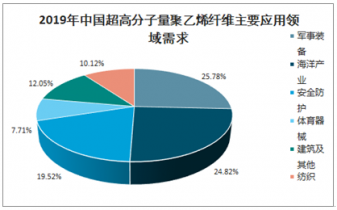 從中國超高分子量聚乙烯(UHMWPE)纖維主要應(yīng)用領(lǐng)域需求來看,2019年,軍事裝備領(lǐng)域應(yīng)用的超高分子量聚乙烯(UHMWPE)纖維需求最高,占比約為25.78%;海洋產(chǎn)業(yè)領(lǐng)域應(yīng)用的超高分子量聚乙烯(UHMWPE)纖維需求占比位居第二,約為24.82%;安全防護(hù)領(lǐng)域應(yīng)用的超高分子量聚乙烯(UHMWPE)纖維占比位居第三,約為19.52%。
