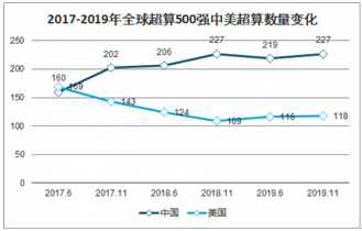 2017-2019年全球超算500強中美超算數(shù)量變化