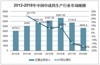 2012-2018年,中成藥生產(chǎn)行業(yè)市場(chǎng)規(guī)模波動(dòng)下降趨勢(shì),同比增長(zhǎng)也呈現(xiàn)下滑趨勢(shì), 2018年,我國規(guī)模以上中成藥生產(chǎn)企業(yè)主營(yíng)業(yè)務(wù)收入為4655.20億元,同比增長(zhǎng)下滑18.84%。