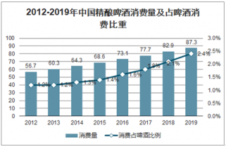 2012-2019年中國精釀啤酒消費量及占啤酒消費比重