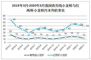 2019年3月-2020年3月我國青殼線小龍蝦與紅兩蝦小龍蝦月末均價變化
