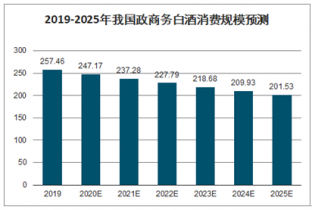 2018年,中國(guó)政商務(wù)白酒消費(fèi)規(guī)模降幅為2.83%,消費(fèi)量?jī)H為268億元。隨著政策的限制,政商務(wù)白酒消費(fèi)規(guī)模仍將繼續(xù)下行,到2025年,政商務(wù)白酒消費(fèi)規(guī)模將僅在201億元左右。