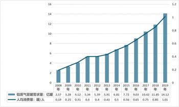 2008-2019年我國(guó)鋁質(zhì)氣霧罐消費(fèi)量及人均消費(fèi)走勢(shì)