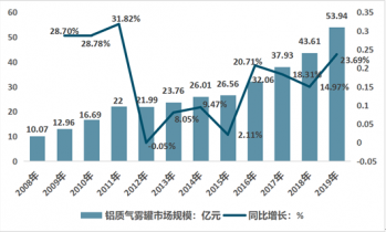 2019年我國(guó)鋁質(zhì)氣霧罐市場(chǎng)規(guī)模為53.94億元,較2018年的43.61億元增長(zhǎng)23.69%。